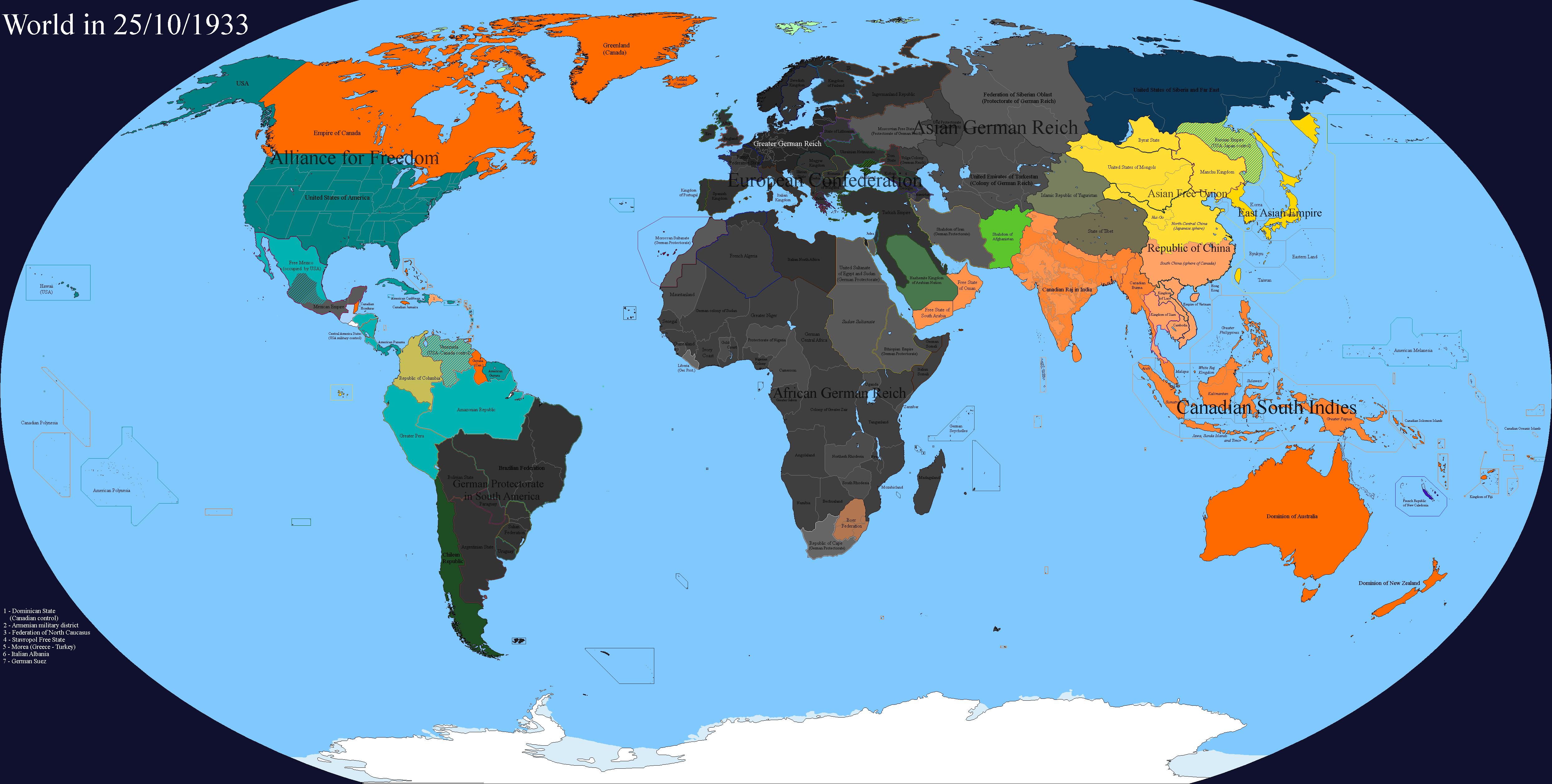 Опубликовано: 23 Oct 2016 Не думает ли Канада вернуть Родные Острова под свою опеку?Не только думает, но и постоянно строит такие планы совместно с американцами. Но после разгрома британского флота и бегства правительства в Канаду такие планы не особо-то реальны, остатки Империи удалось удержать только благодаря вмешательству Штатов. Ну и Японии, которая не пустила дойчей на Дальний Восток.Ингерманландию можно было в Североруссию переименовать.Русских в этом мире больше не существует. Использование такого названия немцы не позволят. Или в Бьярмию, если Кайзеррайх всех германизируетБьярмия - слишком старо и забыто. А Ингерманландией эти земли были всего лет триста назад. И германизируют не совсем всех, только "исторически" германские земли (то есть все, где германцы были ну хоть в каком-нибудь виде).Кстати, как Кайзеррайх относится к евреям?Их попросили на выход в Палестину, которую под это дело отжали у турок. В основном уезжают. Те что остались - нормально, лишь бы преданно служили Рейху.В этом мире Армении не жить. Я думаю, Кайзеррайх скормит ее Турции, где их ждет судьба евреев времен Холокоста, а может и хуже.В реальности турки собирались решить национальный вопрос, но немцы в последний момент спасли армян, да и грузин тоже. Что-то вроде "мы не может позволить им уничтожать христиан". Собственно вот такой огрызок и оставили. Нужно на кого-то опираться, да и это не совсем независимое государство, а оккупационная зона, может, потом и скинут туркам. Или азерам.Что это за штриховка в Греции?Турко-греческая Морея.Судан пытается отделиться от Египта?Это автономный султанат, поэтому подписан отдельно и курсивом.Кто правит в приморской Российской Империи? Выжившие Романовы?Скорее всего какая-нибудь младшая линия, не смирившаяся с немецким сапогом (с)В общем, если откинуть все эти вопросы, то карта получилась отличная. Я уважаю ваш профессионализм. Благодарю :)) Поделиться сообщением Ссылка на сообщение Поделиться на других сайтах