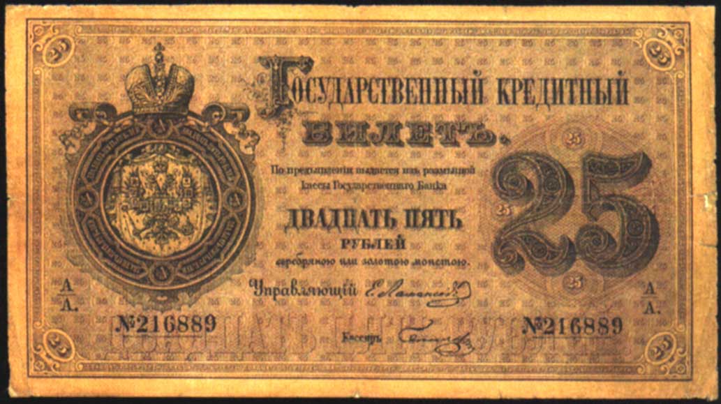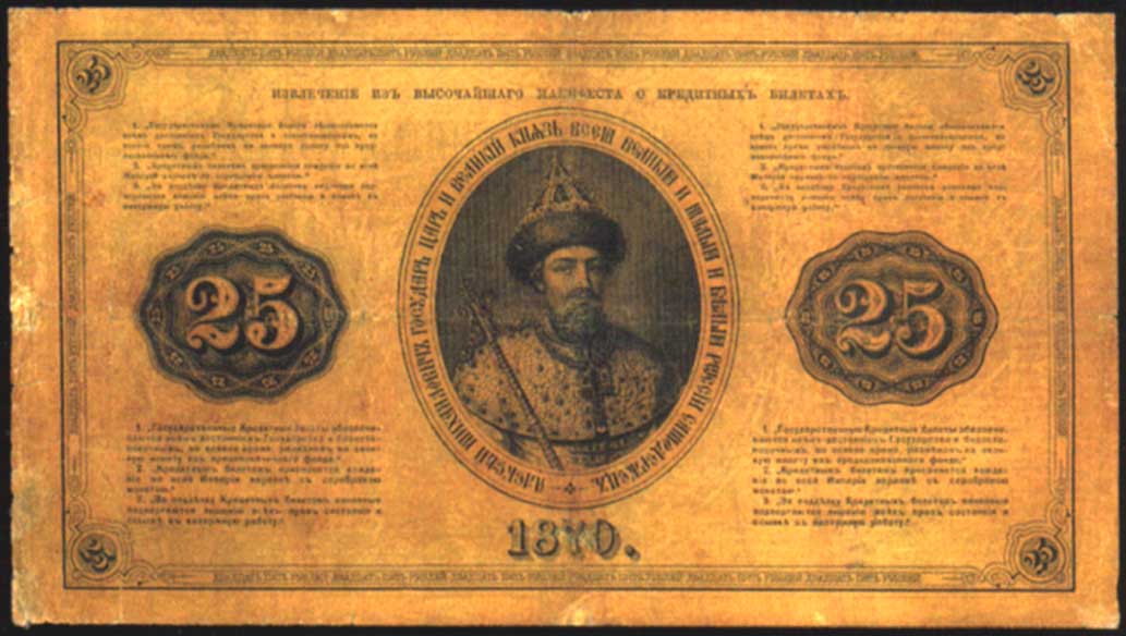 25 рублей образца 1866, с портертом Алексея Михайловича (доп. выпуски - 1870, 1872, 1874, 1876, 1878 и 1880), в обращении с 1866 по 1902 годы