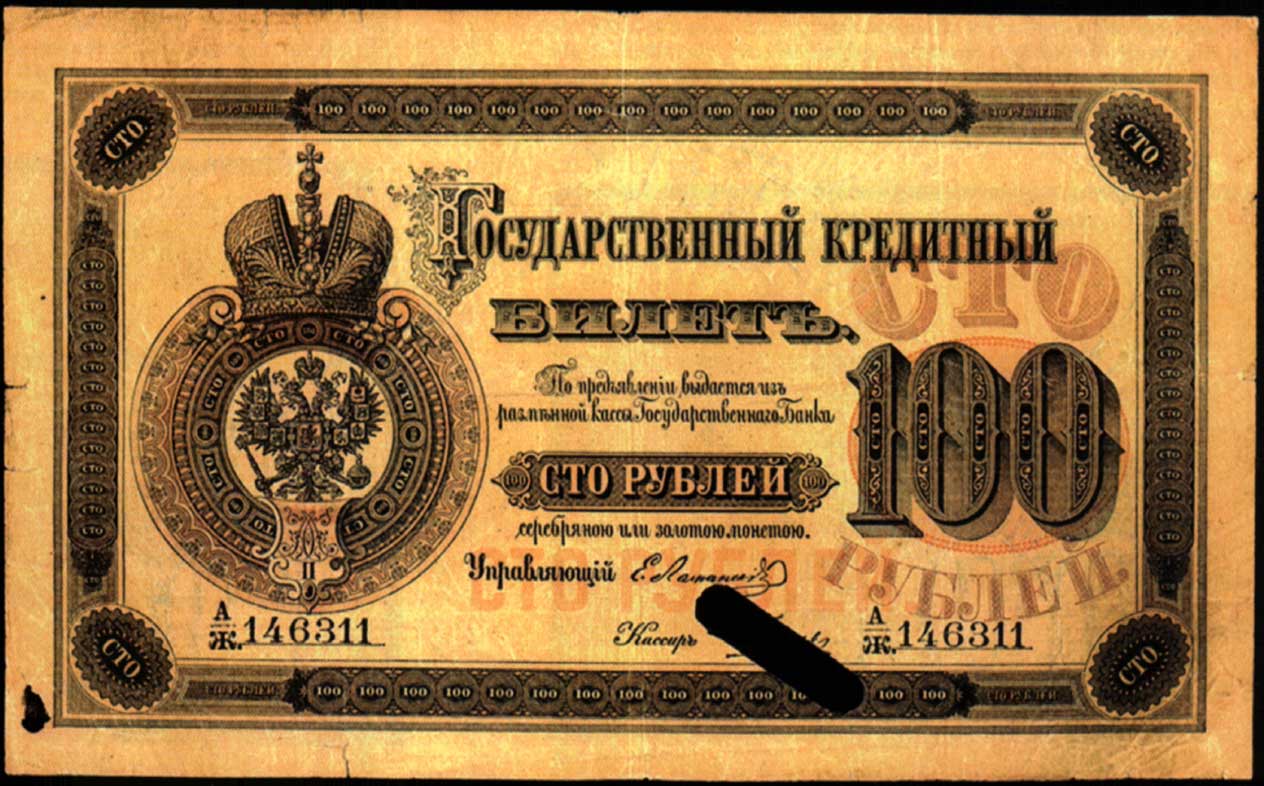 100 рублей образца 1866, с портретом Екатерины II (доп. выпуски - 1870, 1872, 1874, 1876, 1878 и 1880), в обращении с 1866 по 1902 годы
