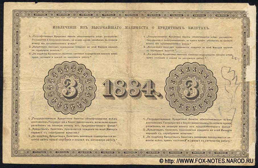 3 рубля образца 1887 (доп. выпуски 1889, 1890, 1892, 1894), в обращении с 1887 по 1902 годы