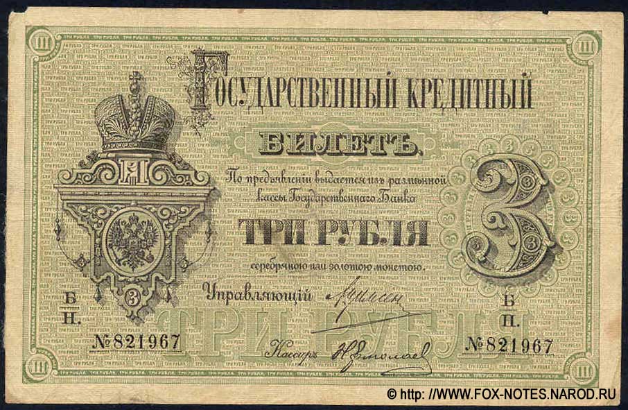3 рубля образца 1866 (доп. выпуски - 1870, 1872, 1874, 1876, 1878 и 1880), в обращении с 1866 по 1902 годы