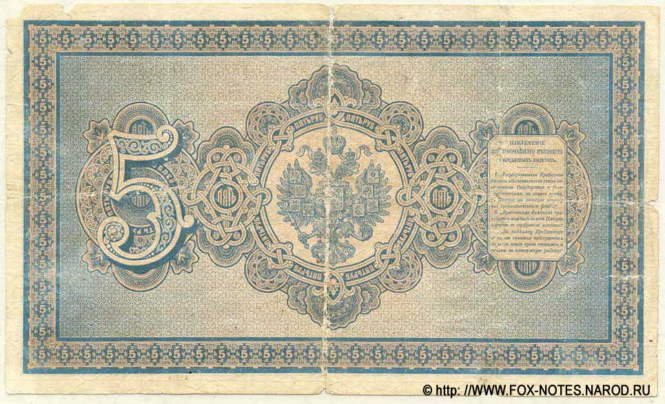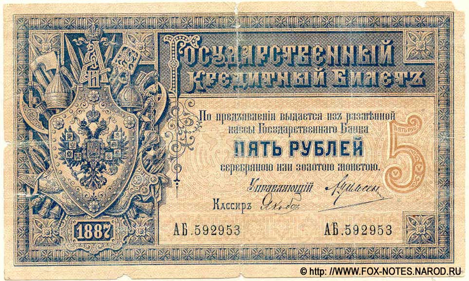5 рублей образца 1887 (доп. выпуски 1889, 1890, 1892, 1894), в обращении с 1887 по 1902 годы