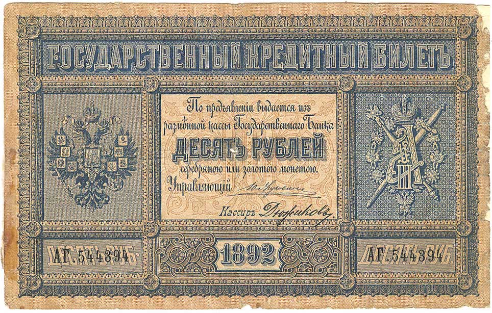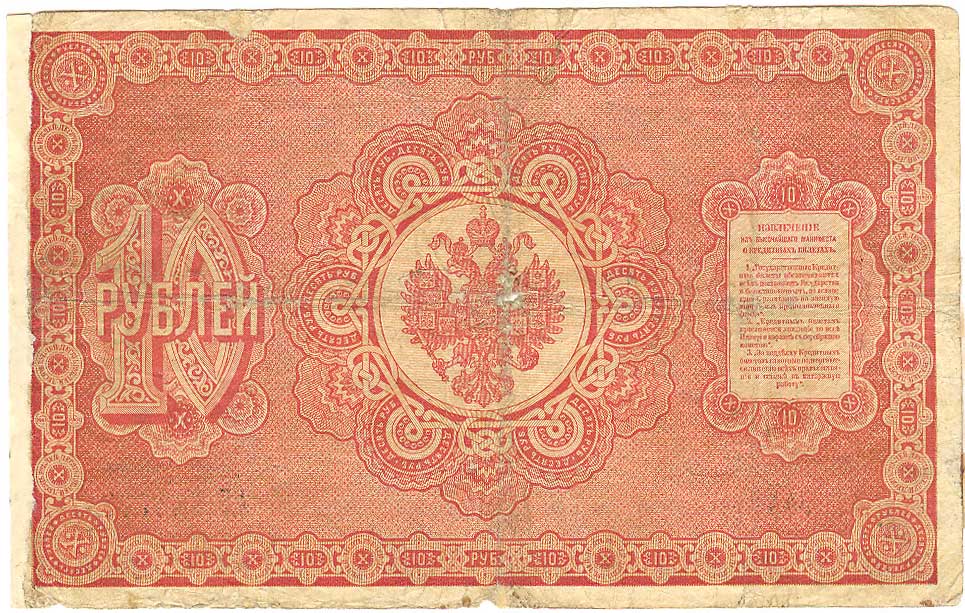 10 рублей образца 1882 (доп. выпуски - 1884, 1886), в обращении с 1882 по 1902 годы
