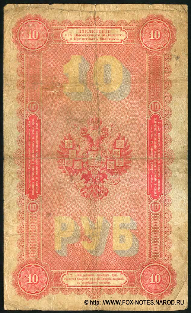 10 рублей образца 1866, с портретом Михаила Федоровича (доп. выпуски - 1870, 1872, 1874, 1876, 1878 и 1880), в обращении с 1866 по 1902 годы