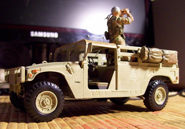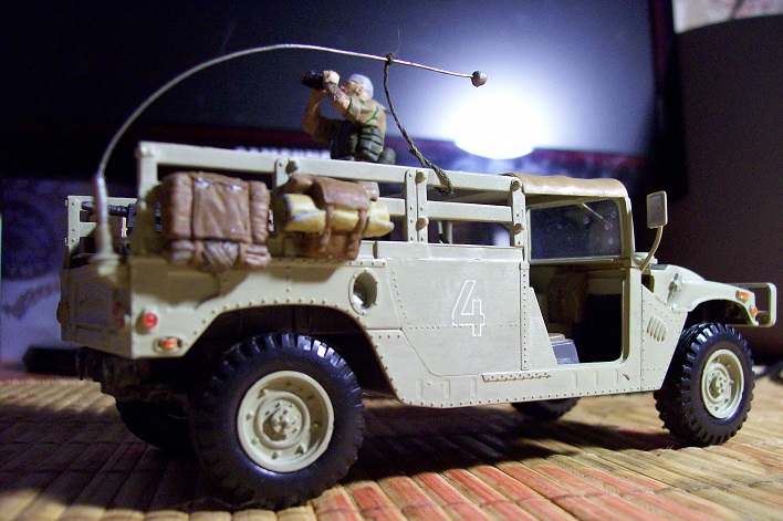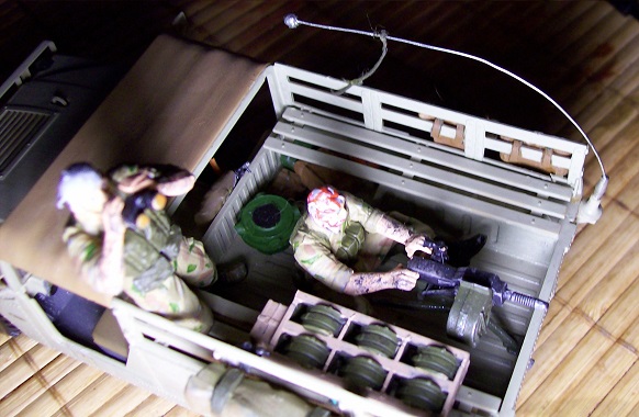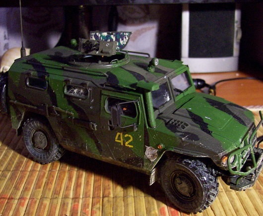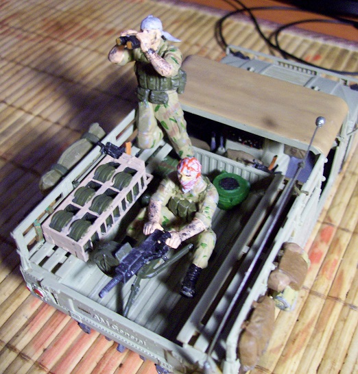 Опубликовано: 26 Dec 2014 (изменено) Немного в пику сломанному советскому БПК (Но безо всякой политики! На момент сборки этой модели, никакого захвата ИГИЛ американских складов еще в природе не было!) Трофейный Хамви с сюрпризом. Ну просто скучно стало все строго "по инструкции" собирать, вот и начал хулиганить. "Саддамовцы" до сборки и покраски были советским спецназом из Афгана. Командир - опять жертва вивисекции ног, бондана обмотанная вокруг лица стрелка, - самодельная: кусок бумажной салфетки, пропитанной клеем (у него рожа была чересчур славянская ). АГС из того же набора, что и солдаты, а вот уложенная горизонтально на лавку стойка под коробки БК и сами коробки, - неиспользованная на родной модели, часть внутреннего интерьера БА "Тигр". Обвес и всякая мелочь в кузове, - остатки самых разных наборов, наскребённые по сусекам. А вот, кстати и сам донорский Тигр Изменено 26 Dec 2014 пользователем Кот Поделиться сообщением Ссылка на сообщение Поделиться на других сайтах