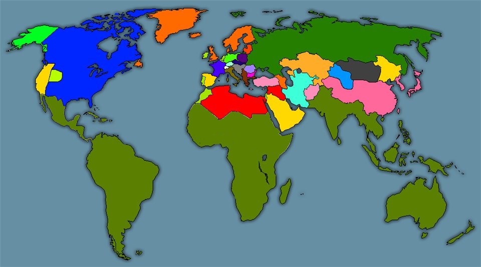 Африканская советская федеративная республика Все оставшиеся африканские страны, Антарктида. Население 750 млн. В западных и центральных областях развито сельское хозяйство, в восточных производство хай-тека, машиностроение (в основном боевое). союзник МСС. Имеются заводы сверхмощного энергетического оружия.