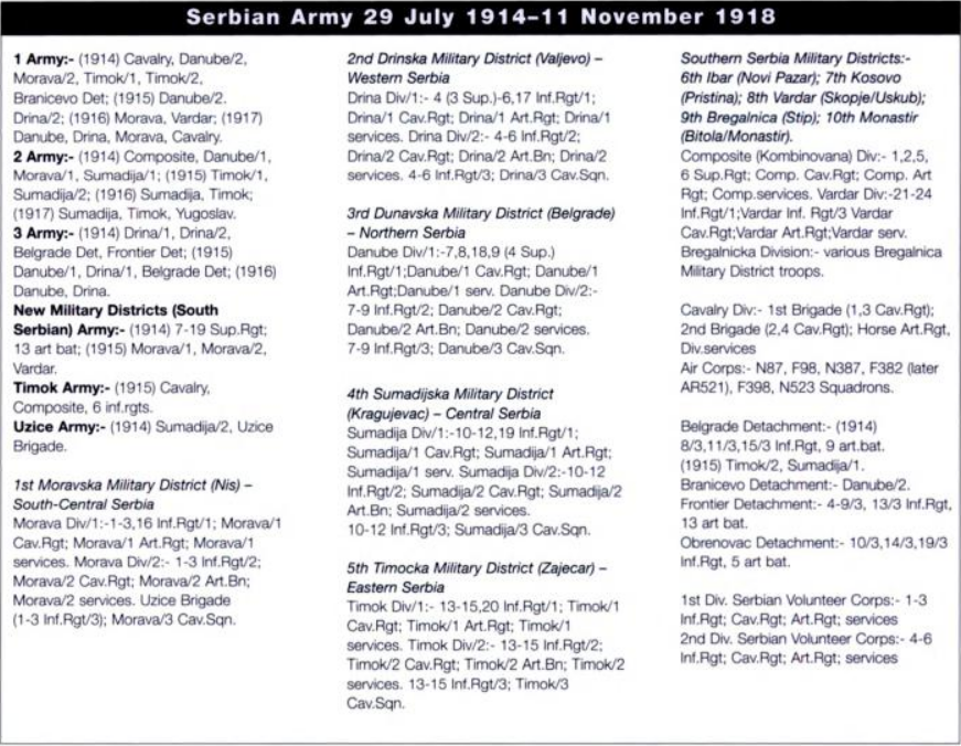 Опубликовано: 6 Sep 2013 (изменено) В мирное время или в октябре 1915 года? Есть разница. насколько я помню речь шла о военном времени А если точно? У Крома данные откуда? Я уже неоднократно убеждался, что никому верить нельзя. но даже если и мирное - то у сербов не так много сил чтобы закрыть все дыры Реалии 1915 года на 1914 автоматически не переносятся. Сербия уже год воюет, понесла огромные потери. 1) Сербы признавали опасность Нишского направления, раз понастроили на нем крепостей. К примеру, против Австро-Венгрии современных крепостей с фортовыми поясами не было вообще. 2) В крепостях должны быть гарнизоны, иначе нет смысла эти крепости строить. 3) Под гарнизоны крепостей у сербов были войска - третий призыв в числе 15 полков. См. картинку. Изменено 6 Sep 2013 пользователем Вандал Поделиться сообщением Ссылка на сообщение Поделиться на других сайтах