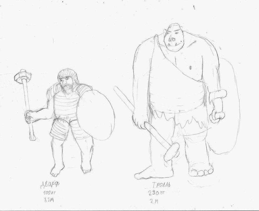 *Тролль. Масса - 230 кг, рост - 2 метра. Огромный, тяжелый воин. Имеет очень толстые слоноподобные ноги, благодаря чему на него можно навесить много брони, что делает его крепким орешком. Его тяжелые доспехи трудно пробить даже пулей. Однако, у него есть слабые места, особенно ноги. После прихода человека оказался на грани вымирания.