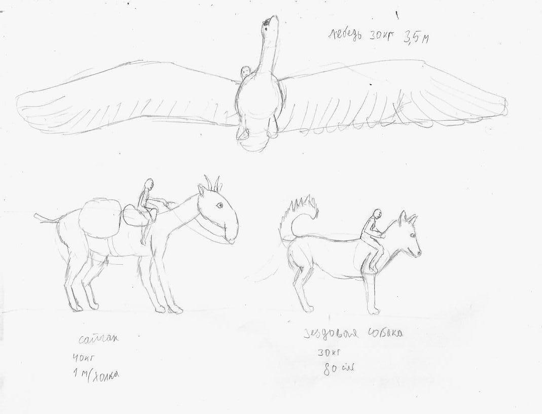 * лебедь. Масса - 30 кг, размах крыльев - 3 метра. Из за этой чертовой птицы, провалились все попытки пиндосов поработить лилипутов. Лилипуты могли использовать лебедей как живые самолеты. По некоторым показателям, особенно маневренности, они даже превзошли самолеты механические. Самой главной проблемой лебедей была их недостаточная мощность и скороподъемность.