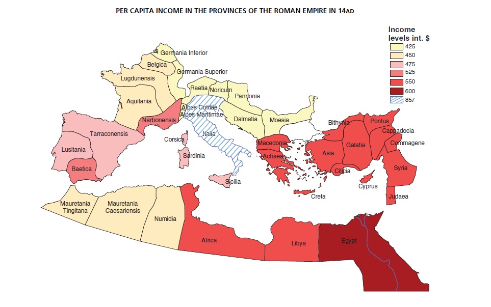Maddison Project произвели оценку подушевого ВВП в поздней Римской империи – около 1300 международных долларов 1990 года. В наиболее богатом регионе – Италии – подушевой ВВП был на 40% выше, чем в среднем по империи: порядка 1800 международных долларов 1990 года.