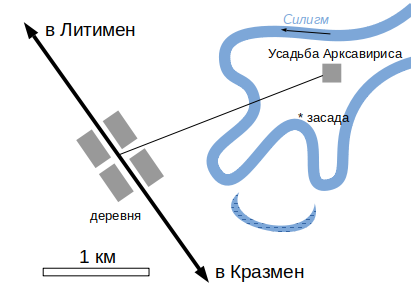 Я включил планшет (плохо: заряд уже 20%, а запасной аккумулятор остался в кофре). Загрузил навигатор. Наша река называлась Силигм и текла необычайно извилисто. После усадьбы Арксавириса она делала несколько излучин, образуя контур трёхпалой лапы, и – сюрприз! – возвращалась опять к усадьбе Арксавириса. Мост пересекал лапу между первым и вторым пальцами, а мы сейчас находились вблизи кончика второго. До большой дороги Литимен-Кразмен было около километра в юго-западном направлении. Спутниковый снимок показывал пёстрый ландшафт перемежающихся рыжих и тёмно-зелёных лоскутов.
