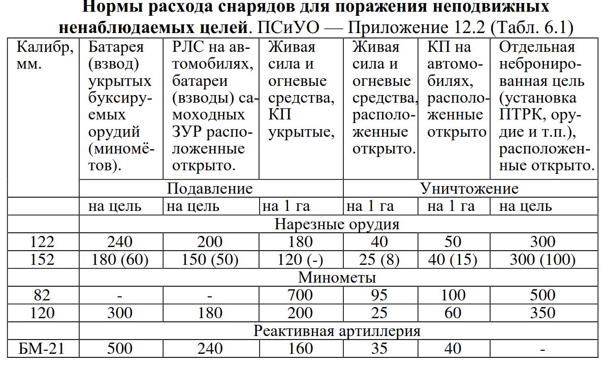 122-мм снарядов для подавления окопанной пехоты нужно в полтора раза больше, для подавления окопанной батареи - на треть больше.