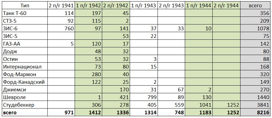 Из интересного про отечественный автотранспорт можно отметить, что в 1942-43 годах на шасси ЗИС-5 смонтировали 75 БМ-13, в то время как в 1941-м году БМ-8-36 ставили на ЗИС-6 (259 штук). с учётом того, что в 1941-м выпустили 5 БМ-8-32 на ГАЗ-АА, а в 1942-м году - 137 БМ-8-24 на том же ГАЗ-АА, можно предложить для АИ более рациональное использование автошасси: на ЗИС-6 монтировать только БМ-13, а для БМ-8 использовать ЗИС-5 и ГАЗ-ААА (никак не пойму, почему в отчётах упоминаются только ГАЗ-АА и нет ни одного ГАЗ-ААА?)