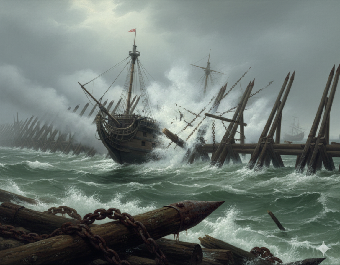 Описание из хроник: Сооружение представляло собой лес из мачт и бревен, торчащих из воды под углом, переплетенных цепями. Со стороны это выглядело как частокол, вырастающий прямо из бушующего моря.